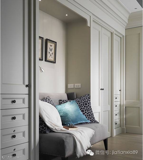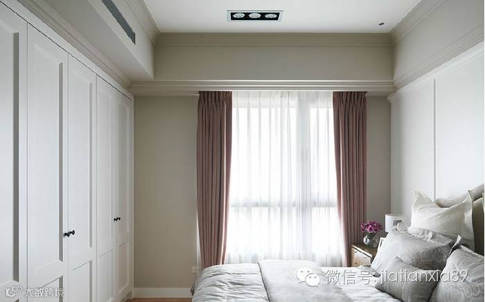 以母亲的喜好为主,赋予美式古典基底,搭上经典白色壁板及衣柜,与天花板的雾乡色搭接,呈现典雅温婉的寝居风情。
