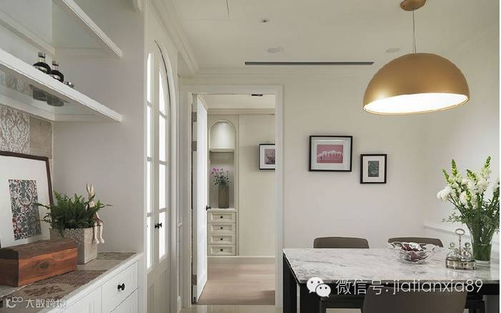 随着端景柜将客厅的现代感,过渡到餐厨区的美式古典,考虑到家人虽然每天开伙,但停留于餐厅的时间不长,因此就将空间留给使用时间较长的主卧,在简单小巧的餐厅加入些微乡村元素,营造温馨用餐风景。