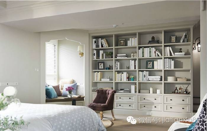 大面积书柜整合窗旁的三角卧榻区,成了夫妻俩最喜欢窝在一起阅读、闲聊的惬意角落。