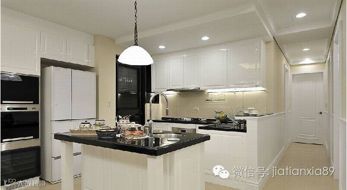 整合了水槽与电磁炉的L型中岛台面,配合美式线条的柱脚设计,以及古典线板门片,让中岛造型同时兼具了典雅美感和实用性。