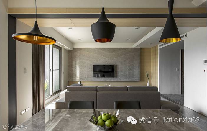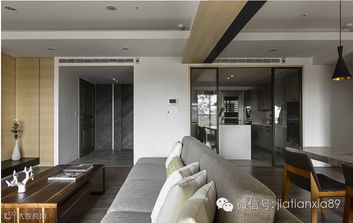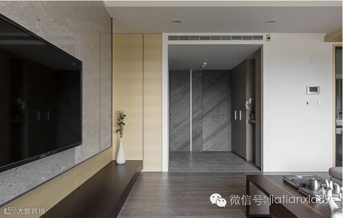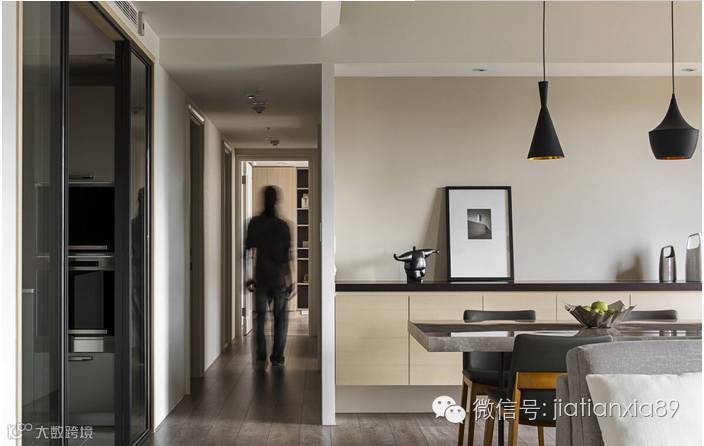 “延续着现代简约空间的清爽表情,设计师带入更为内敛沉稳的用色,由玄关的斜纹薄石板开始,乃至全室空间的地面选色,对比空间基底的白净,带入暖灰色的立面家私选色,调和出沉静的人文居宅气质。”