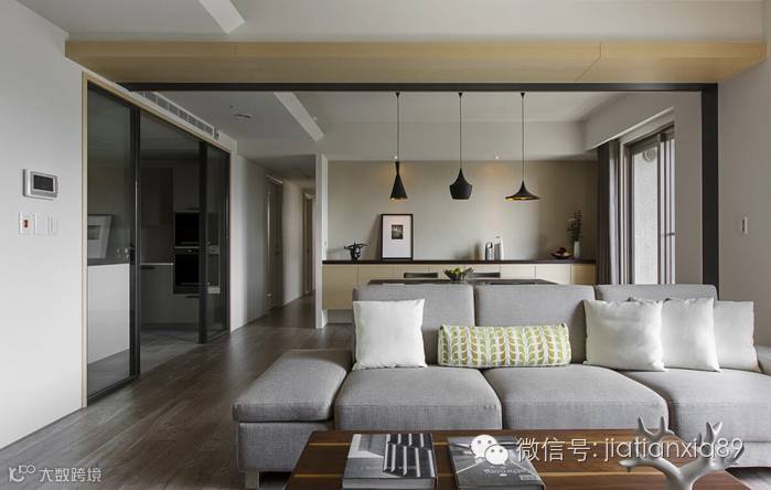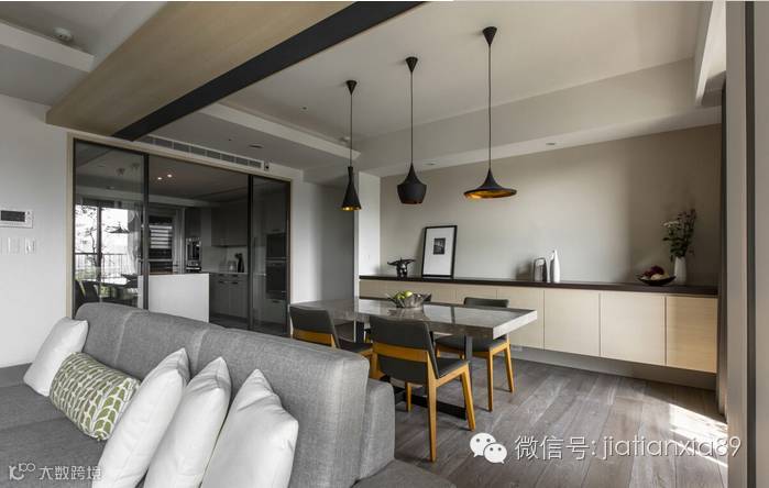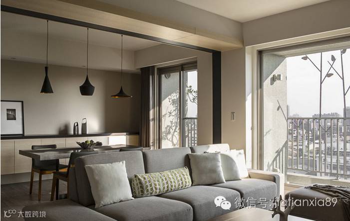 仅以沙发作为客餐厅实质的区隔,餐厅处跳以暖灰色阶的立面,成为客厅沙发背墙的视觉景深,将光线的延续,以及人文感的摆饰纳为风景。