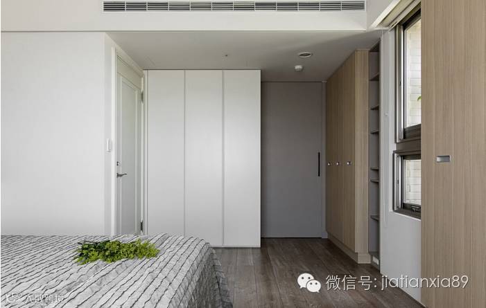 利用柱间凹槽深度以及动线门扇后方空间,安排入一道道衣物收纳柜体,并未划分更衣间的主卧,同样拥有充裕的收纳空间,空间感则更为宽适。