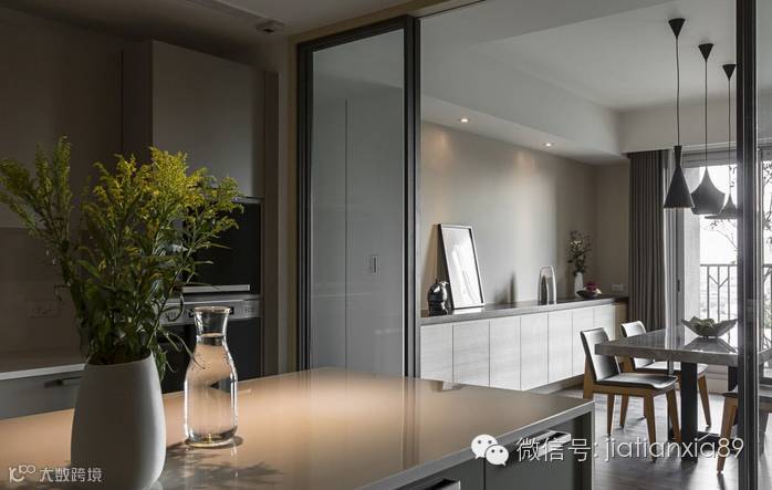原先以开放式设计规划的厨房空间,在参考入屋主的煮食习惯后,以铝框玻璃门构成对开隔间,在空间感的串接之中,创造油烟阻隔弹性。