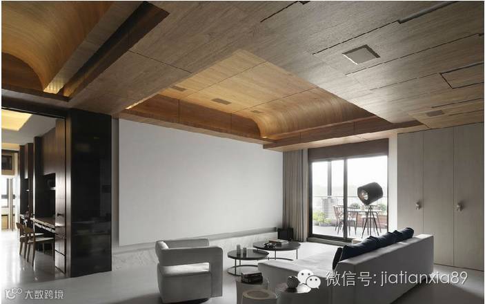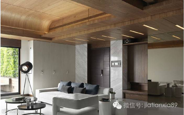 考量洒水头过低以及错综复杂的管线布局,以弧度造型带入屋主钟爱的木皮元素,巧妙修饰过于压迫的屋高尺度。