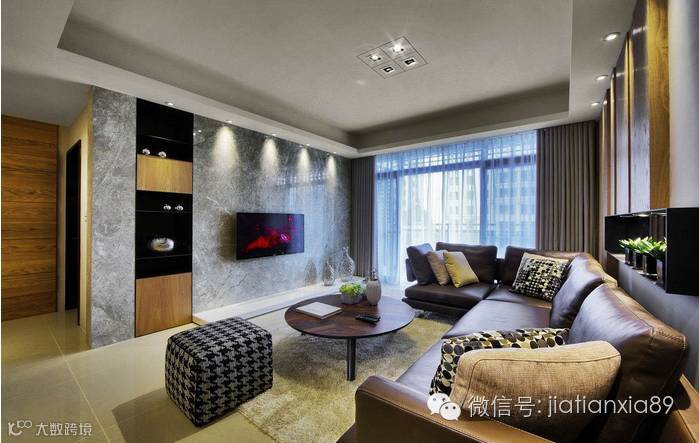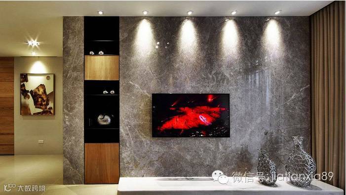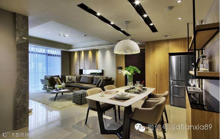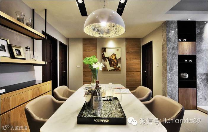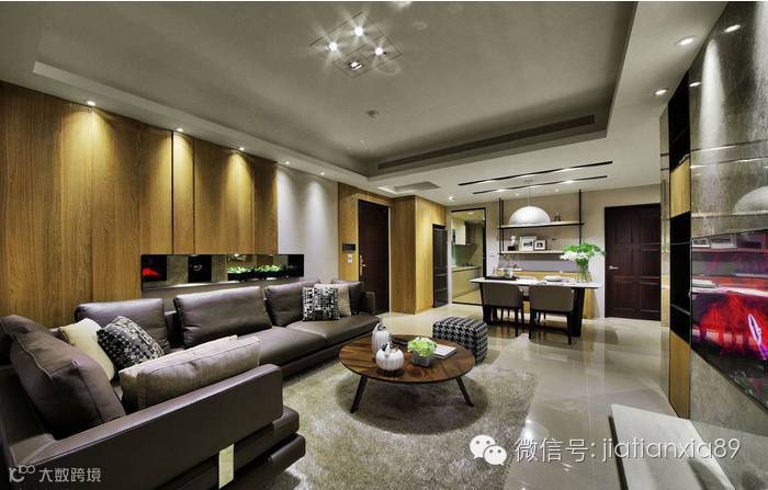 业主希望在结束每天繁忙的工作之后, 可以回到一个温馨又能够沉淀心灵的家。于是,设计师以简约的线条、恰到好处的分割比例,使粗犷的钢刷木皮与质地光滑典雅的石材能够取得完美的对比、平衡,在灯光的烘托下,彰显恢弘大器又不失温馨的空间表情。