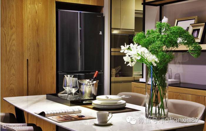 白橡木钢刷板既是立面造型,也是理想的柜体收纳,将冰箱量身镶嵌其中一点也不显突兀。