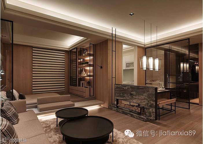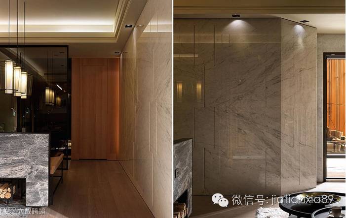 结合石材、木皮、铁件、玻璃等多种材质,搭接出丰富的层次效果。