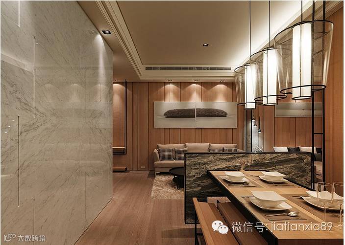 半高电视墙区隔出餐厅与客厅空间,搭配石材壁面以及玻璃吊灯,带来现代感设计。