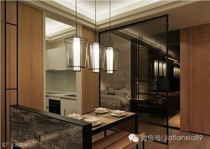 设计师借由不同材质的搭接,以铁件、玻璃、木皮、石材等多媒材的质感,丰富空间的层次,给予舒适、自然的体现。通过各个空间的不同材质的重叠使用,打造空间的多重样貌,创造出小户型空间的多重利用价值。