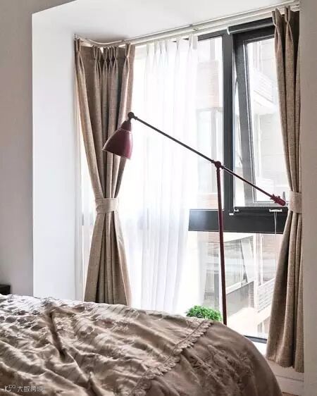 卧室还是以实用为主。厚重的深色窗帘能有效隔音隔光线,利于休息。屋主还在卧室放置了落地灯,应该是当床头灯。