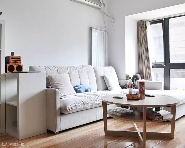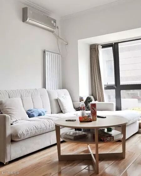 客厅最占地方又必不可少的就是沙发,特意选用了小尺寸的“L”型沙发,实用占用空间少,很适合小客厅。对于沙发的颜色,屋主选择了很素很素的灰偏白的颜色,比较容易脏。其实其他浅色沙发,例如浅灰色,也是不错的选择,大气还不容易脏。