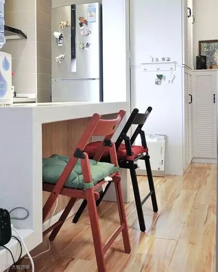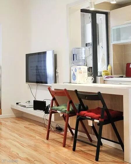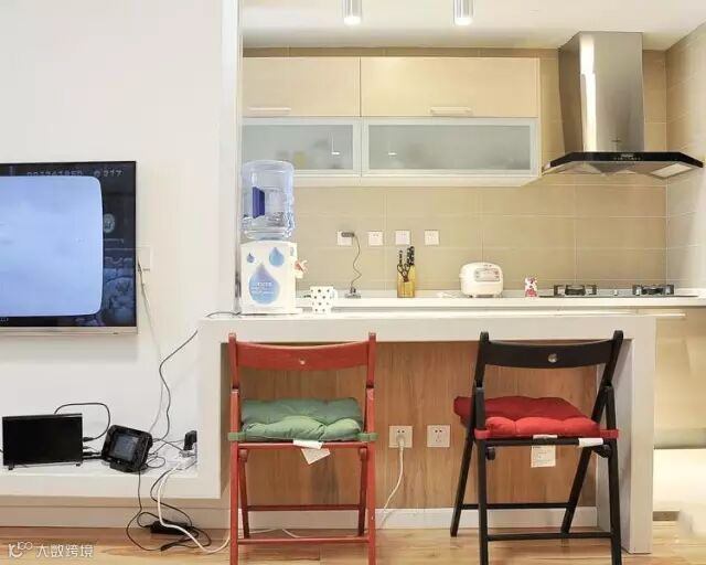 没有放餐桌,做了个时尚的家居吧台,一物多用,既是隔断又是餐桌,很适合2人家庭,但人一多,显然不适用了。屋主还细心地在吧台下面设置了插座,两个人吃火锅时可以用。