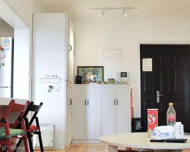 小户型最担心的就是收纳了。屋主在收纳这方面也比较注重。玄关处有一大块转角,靠边放置“L”型衣帽柜最合适了。