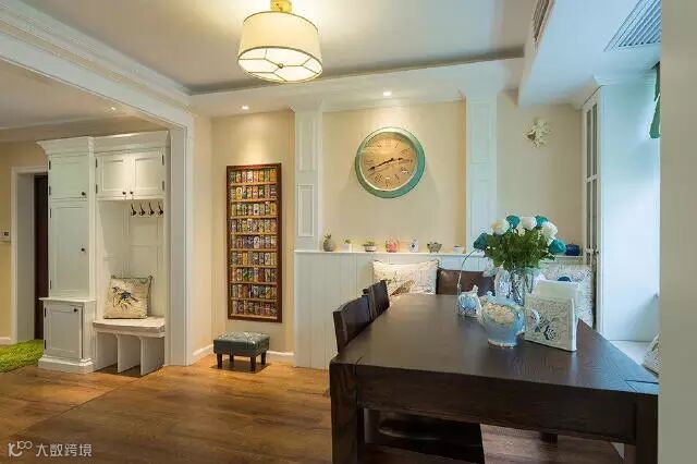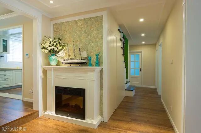 从大门进来,首先是进门的玄关,美剧中是不是常出现这种壁炉,配上白色的山茶花,一艘小船寓意带着我们全家幸福起航。