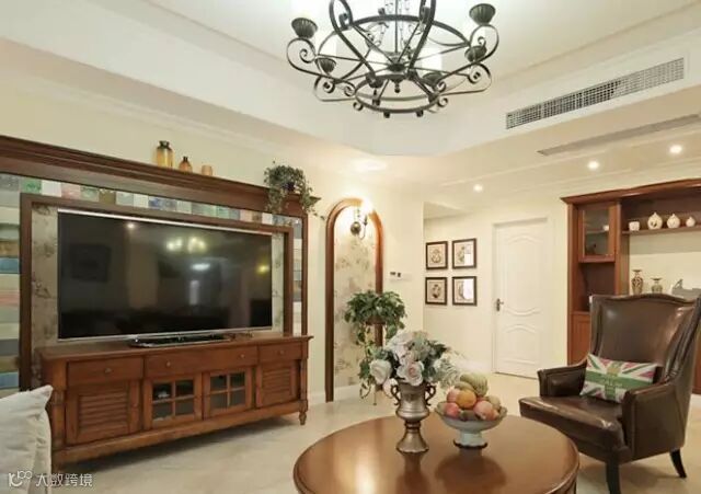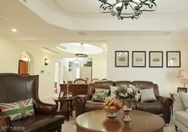 客厅大气又洋气。浅色地砖与深色家具在颜色上形成一种调和。米黄色仿古地砖特意斜铺,不会显得呆板。经典美式家具,深色木质家具和皮质沙发,独具质感和品位。