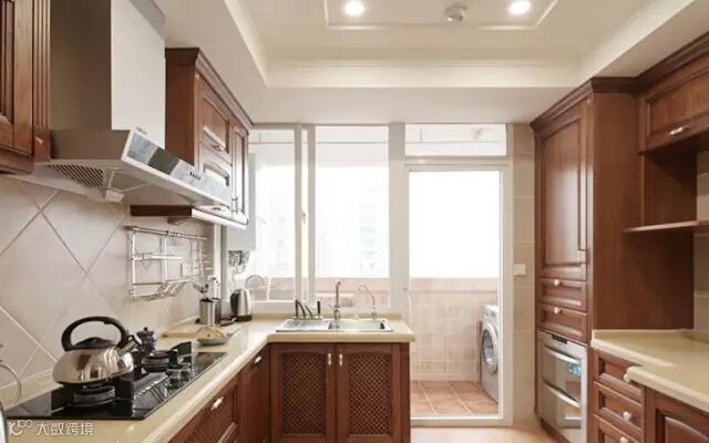 厨房连着小阳台,采光特别好。整套的木质橱柜特别有格调,