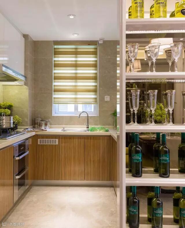 厨房与酒柜相贴,木色的橱柜散发着清新的气息。