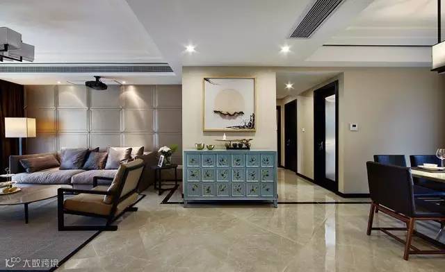 ▲ 入户无玄关,开放式的客厅和餐厅空间,端景是一个蓝色的仿古多斗柜