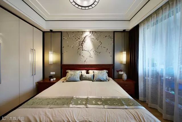 ▲ 床头是腊梅图案壁纸,两侧对称的新中式吊灯配合红木色的床