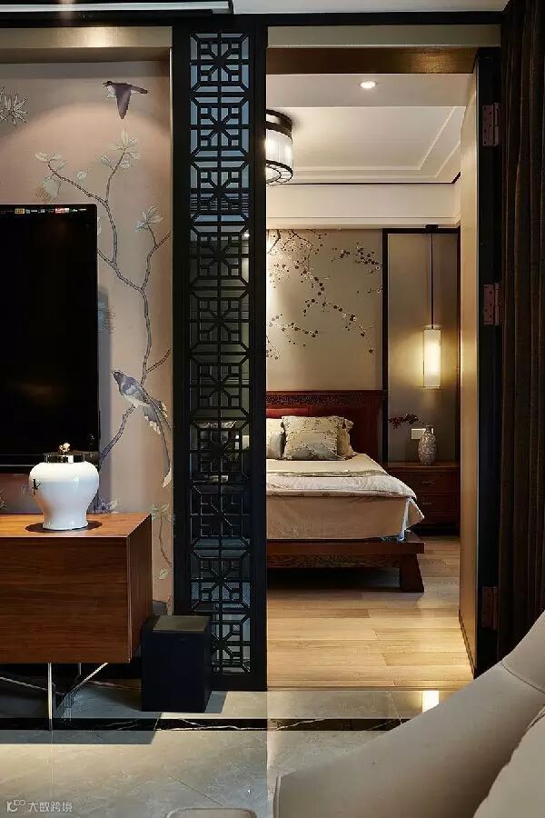 ▲ 主卧床头背景和电视墙呼应,两侧对称雕花屏风设计