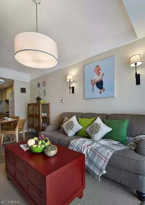 ▲客厅中大红色的茶几是最吸睛的单品,中式设计的茶几与绿色抱枕撞色,不仅不突兀,反而增加了一抹韵味。