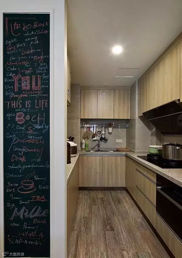 ▲厨房墙边的黑板墙,随意涂鸦或者随手写几句给家人的备忘,都能给生活增加情趣。