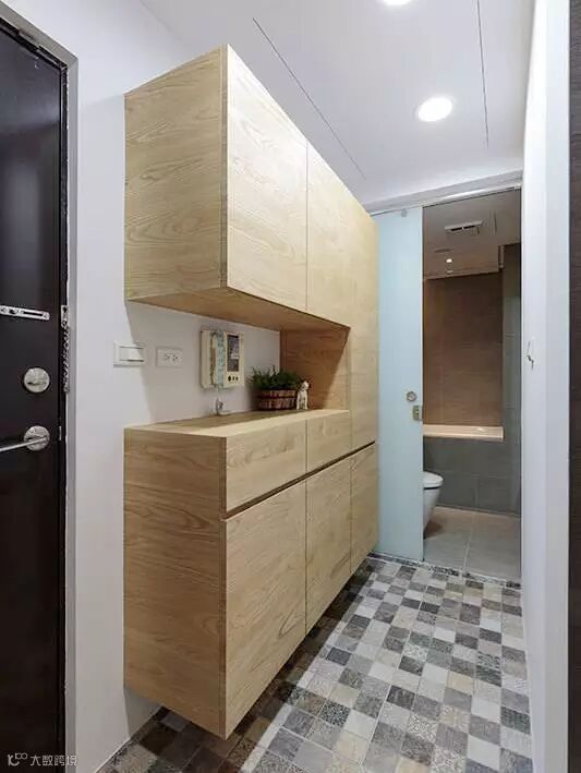 ▲落尘区概念成形的玄关场域,透过磁砖拼接、跳色,导引了收纳与卫浴动线。