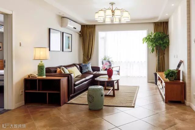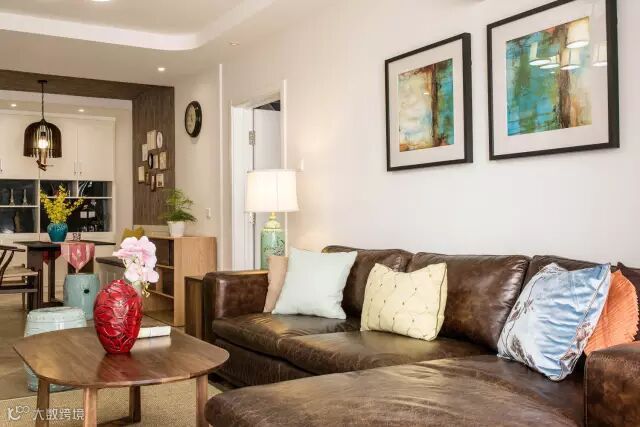 ▲看起来好像巧克力苏打饼的深色真皮沙发,凸显空间的沉稳与诙谐,与地毯和鼓凳等素雅元素很好的搭配;亮色靠包的点缀及配饰的活跃性,让空间达到造型及色彩比例的平衡。