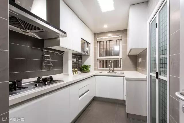 ▲灶台一侧以及地面选择了易打理的深度灰瓷砖,而橱柜和吊顶则用纯白色提亮空间,摆正色彩重心又使人感觉更加清爽洁静。