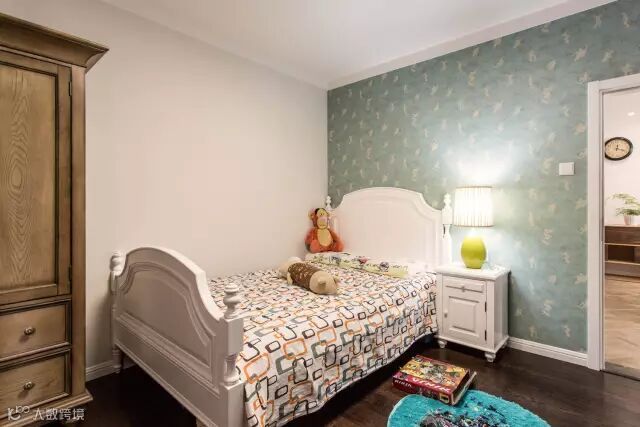 ▲户主卧室的次卧,选择了美式乡村风格的家具,凸显主人大气的性格。用铁艺皮质台灯、蓝色棉麻窗帘等软装加以点缀,让空间层次丰富有内涵。