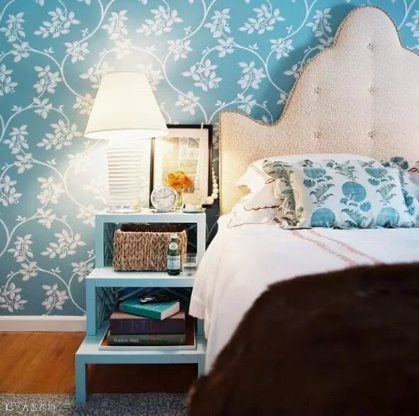 大面积的墙纸使用是房间的亮点,也呼应了床和床上用品的颜色,感觉很温馨。