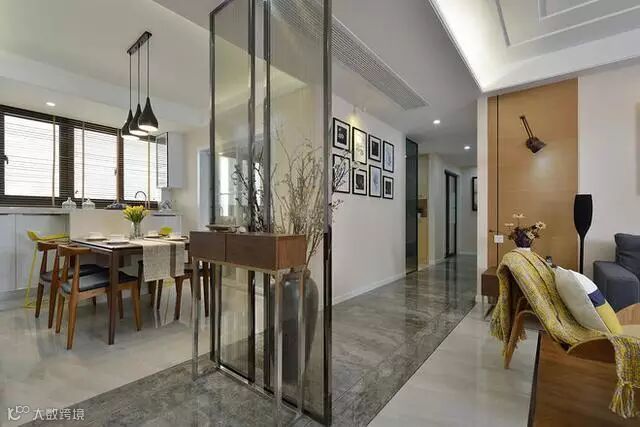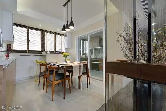 白色吧台,造型别致的亮黄色吧椅,清爽悠闲。原木色的运用让就餐区看起来低调平稳,木质的餐桌和椅子为空间增添了温暖感,头顶柔和光线是渲染就餐气氛的好帮手。