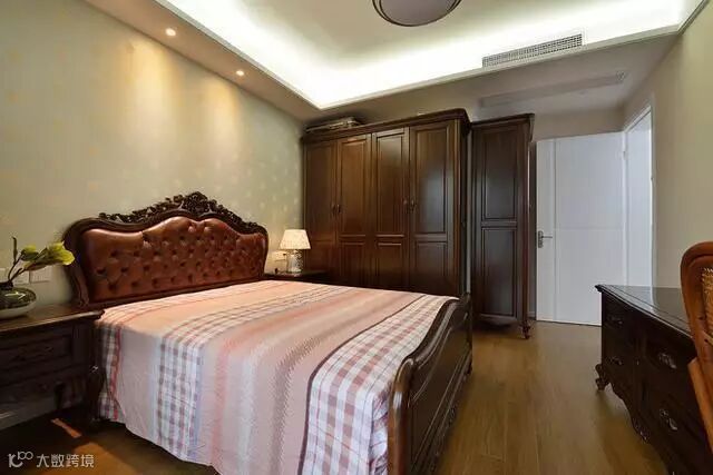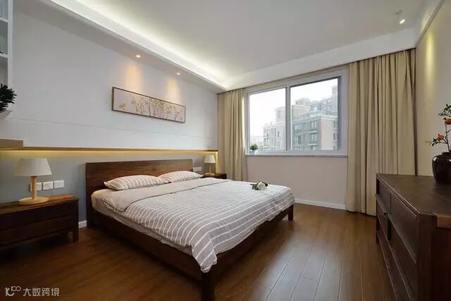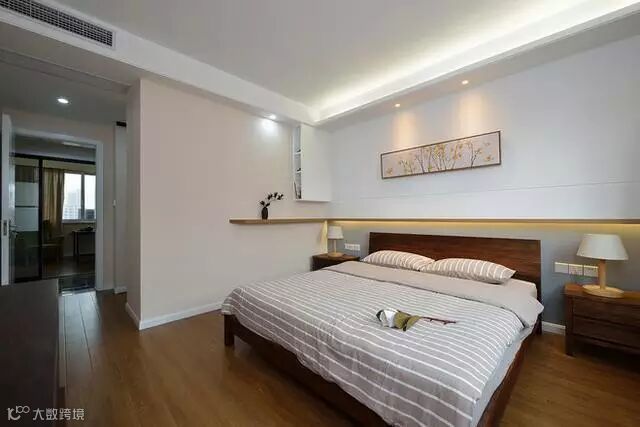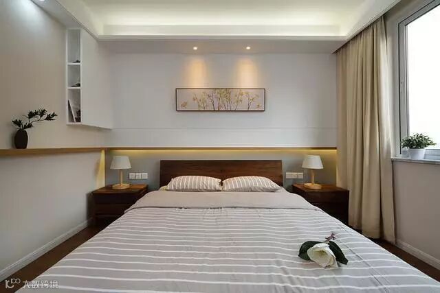 纯白的墙面在木色家具的衬托下反而显出一种设计感在其中,墙面的留白设计与床头旁的储物格都让这间卧室在极简中显得更具有设计感。