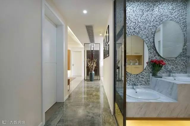 卫生间干区,白色的花纹大理石打造的高低洗漱台,圆形的白色小水池,精致又大方。马赛克拼凑的墙壁,不仅可以避免水滴弄脏墙壁,而且也给纯木色的小空间增添了浪漫的海边气息,温馨无比。
