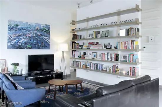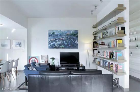 添置的满墙柜层,为生活开辟了实用又可观的收纳空间,中和了客厅的淡色系单调感。