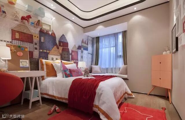 儿童房红的浓烈,可爱至极。待在这样一个活泼色彩的空间里,是一种非常享受的事情,红色的地毯进一步表现了活泼喜悦感。