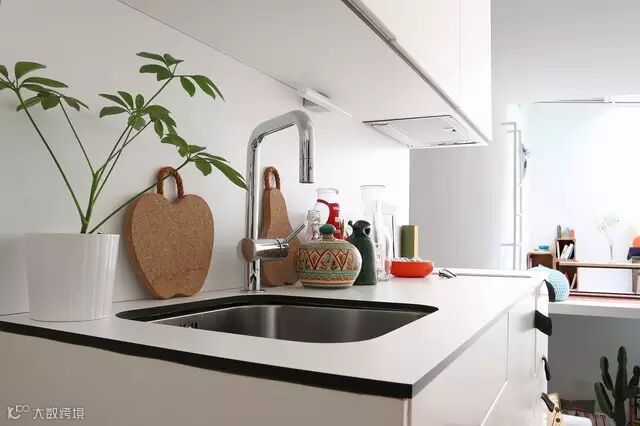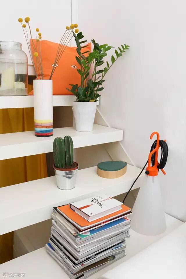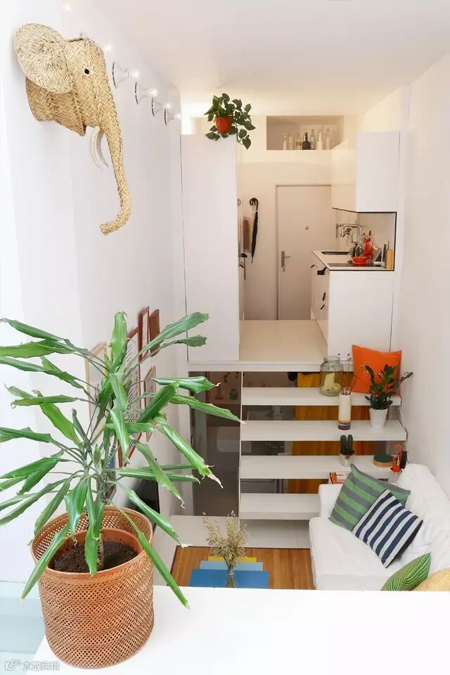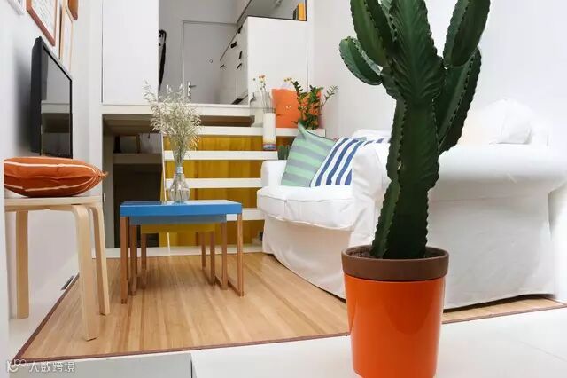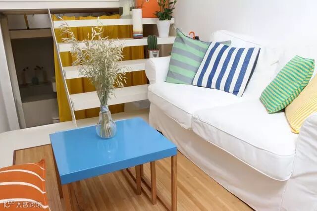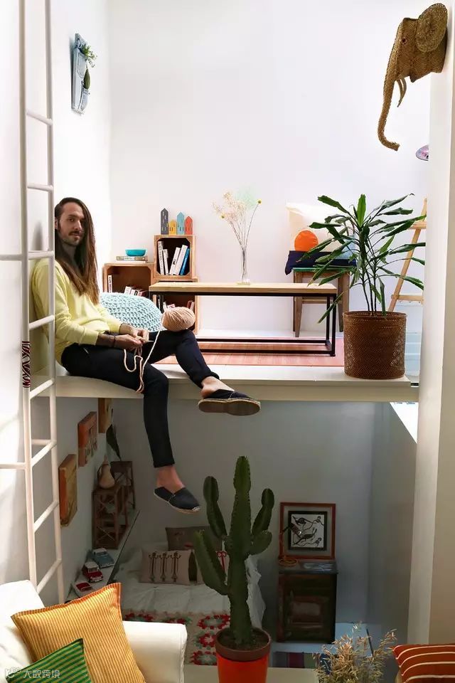 客厅墙壁有个壁梯的设计,通过它可以随意穿梭,往上的空间是光光线充足的工作室,往下则是温馨的小卧室。