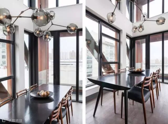 开放式的厨房和餐厅采用了大量的落地窗设计,使空间明亮通透。吊灯的设计充满了时尚的气息。金属元素和木质家具相得益彰,妙趣十足。