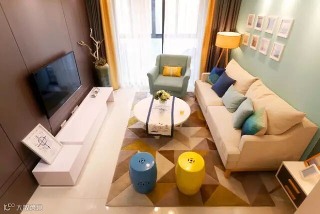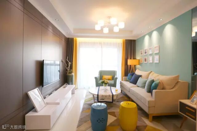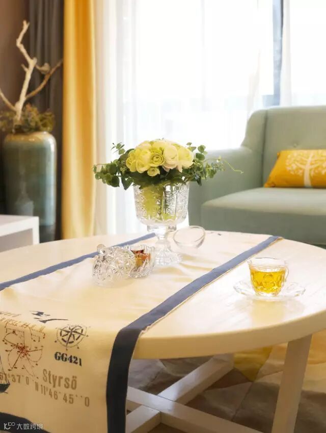 ▲客厅的主色系以烟波蓝为主,米色的沙发,深蓝,浅蓝的抱枕,以及与之呼应的单椅,都是围合在一个色系里,然后利用搭配色的明黄,让整个空间更加跳跃。