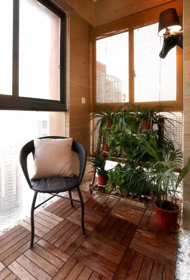 ▲防腐木与鹅暖石,园林的造景手法,运用在阳台,在家也能享受公园般的休憩。