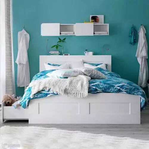 白色的床搭配上天蓝色的背景墙以及床单,首先在视觉上就给人一种特别优雅、清新的感觉。在你注意不到的地方还设计了抽屉样式的收纳,孩子的玩具、零碎的衣物之类的都可以放进去。