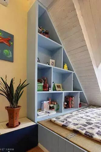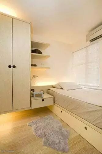 卧室墙面的空间也是个不错的收纳之地,无论是放上几排搁架还是设计成上图所示的样子都能起到很到的作用,而抽屉式的床底设计也是整个空间的第二大亮点。方便实用。