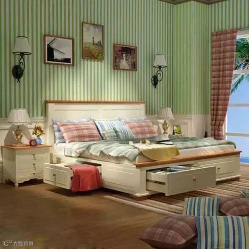 地中海风格带抽屉实木双人床,此款床共四个抽屉,两侧各一个,床尾两个,能做好卧室的收纳。