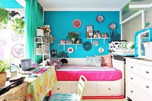 整体都布置的非常紧凑,一点空间都没有浪费,无论是床头的搁架还是墙上的或者是床尾的收纳柜都小巧而精致,虽然东西排放的满满,但是并不显杂乱。