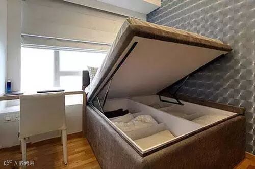 床下的空间藏着大大的隐藏区域,像这样可以翻起的床架大大讨人欢心。