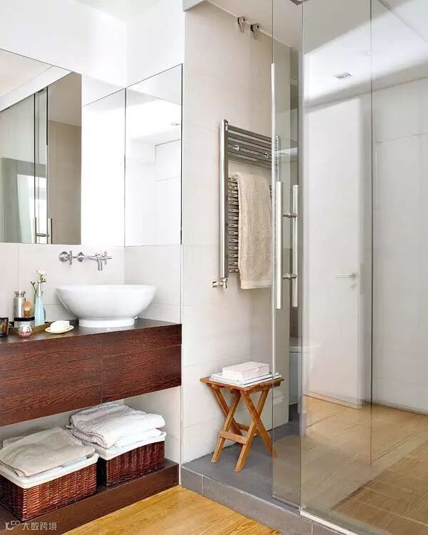 ▲淋浴空间垫高地台处理,玻璃隔断孤立积水区域,从而利于排水,干湿分区。选用无框镜子,以加强空间感。