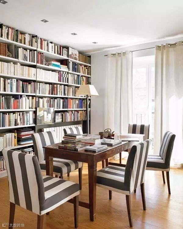 ▲这面大书墙对于爱读书的人来说简直是天堂吧,中式的长条桌搭配色黑白色调的西式椅子,完全没有突兀的感觉。