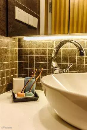 卫生间以深咖咖啡为主,采用整块横幅镜面,可以扩大视觉效果,洗脸盆是摆放式洗脸盆,简单大气。