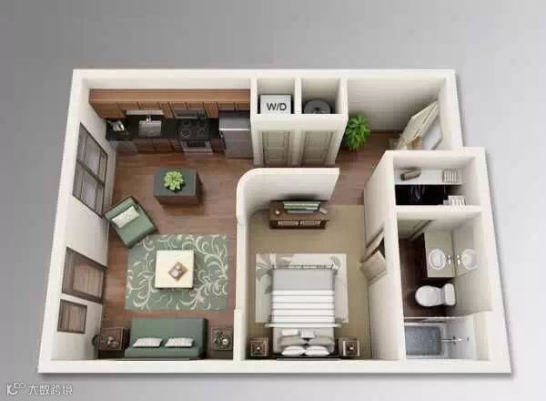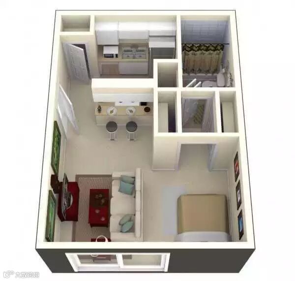 家天下实业这个房间只有约27平方米,但依然有客厅、餐厅、卧室、厨房的功能区。